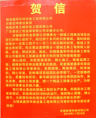 由我公司负责承建的安徽新源热电有限公司2×220t/h煤粉锅炉烟气脱硫工程,经过四个多月的日夜奋战,高80m直径10m的烟塔合一主体工程于2010年11月24日顺利封顶,工程取得阶段性胜利,受到业主及各方的赞誉;脱硫工艺楼也即将封顶,它标志着这套烟塔合一的脱硫主体工程将转入防腐、安装、调试阶段。 项目施工期间,在业主及相关单位的大力支持和配合下,项目部以高度的责任感和饱满的工作热情,高质量、高效率地开展各项工作。他们“坚守一线、不怕苦累”的奉献精神和“诚信负责、顾全大局”的主人翁精神,也得到了公司领导的充分肯定,并向全公司通报嘉奖“安徽新源项目部”。 十二月初,工程将进入后续施工阶段,主要对塔内进行喷砂防腐施工、安装除雾器、塔内喷淋层、循环水泵进出口玻璃钢管施工等,全体项目部成员将再接再厉,确保工程顺利全面竣工。