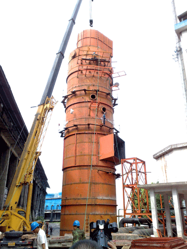 5月31日,我公司承建的福建省青山纸业股份有限公司150t/h循环流化床锅炉烟气脱硫项目脱硫塔顺利封顶。 该项目于4月8日开工,项目部人员努力克服天气影响,经过一个多月的艰苦奋战,较好地确保了工程进度,日前完成脱硫塔封顶,塔体安装总高度为28米。下一步将进行脱硫塔进出口烟道连接安装,塔体平台、爬梯安装焊接,塔体进行喷砂除锈、涂刷玻璃鳞片等防腐施工,预计七月初可完成。