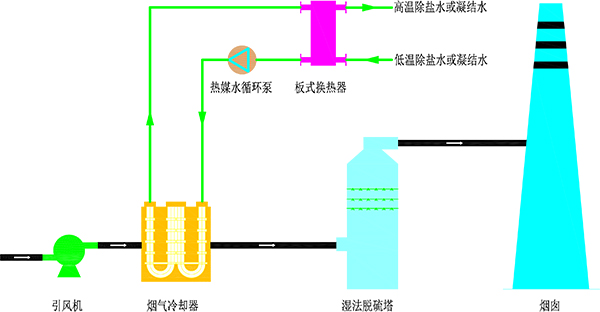 热媒水循环系统:循环热媒水进入烟气冷却器吸收高温原烟气热量,升温后进入板式换热器,用于加热低温(锅炉给水)除盐水或锅炉凝结水,降温后的热媒水通过热媒水循环泵升压后再次进入烟气冷却器循环使用。